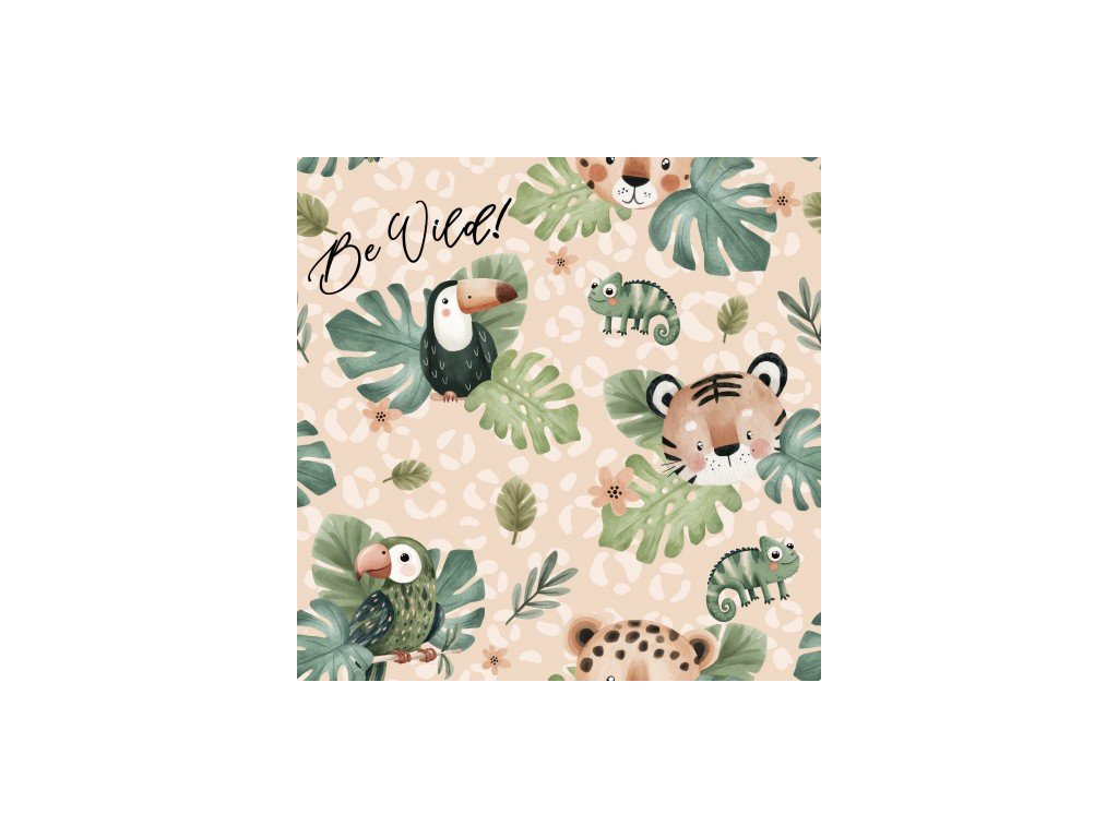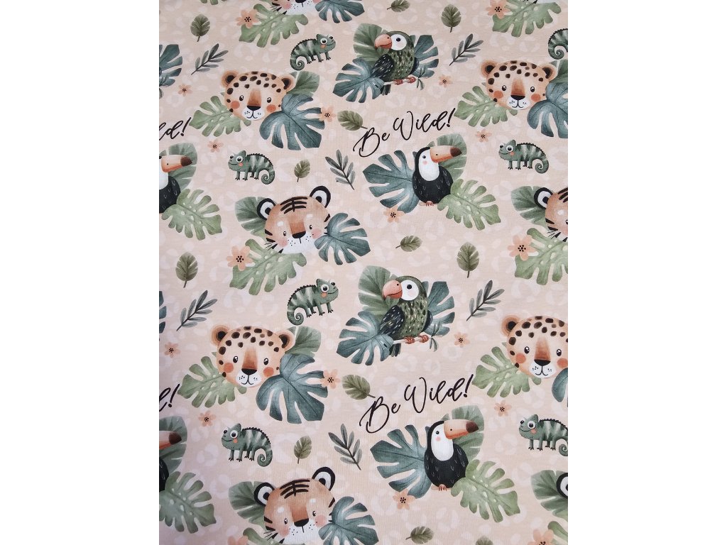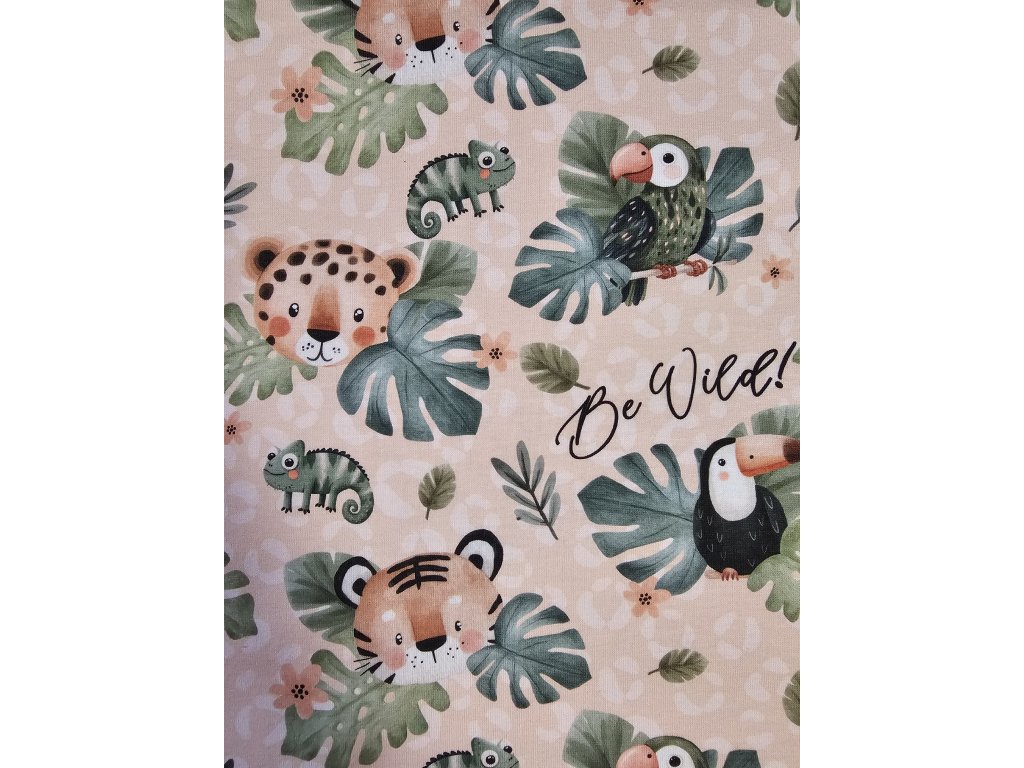 Vzor s divokým tigrem, papoušky, tukany, chameleonem a nápisy s meruňkovým pozadím