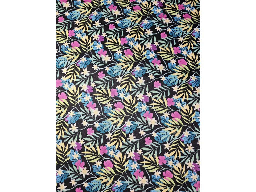 Kočárkovina – Botanický vzor s květy ibišku, drobnými kvítky a listy kapradí na černém podkladu. Vhodný doplnit černou nebo magenta barvou jednobarevné kočárkovinoy