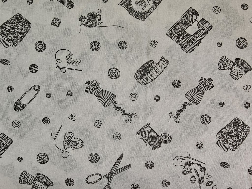 Pevná látka s tématikou šití je vhodná na šití ubrusů, prostírání, povlaků na polštáře, podsedáků a dalších bytových dekorací. Můžete z ní ušít i tašky.
