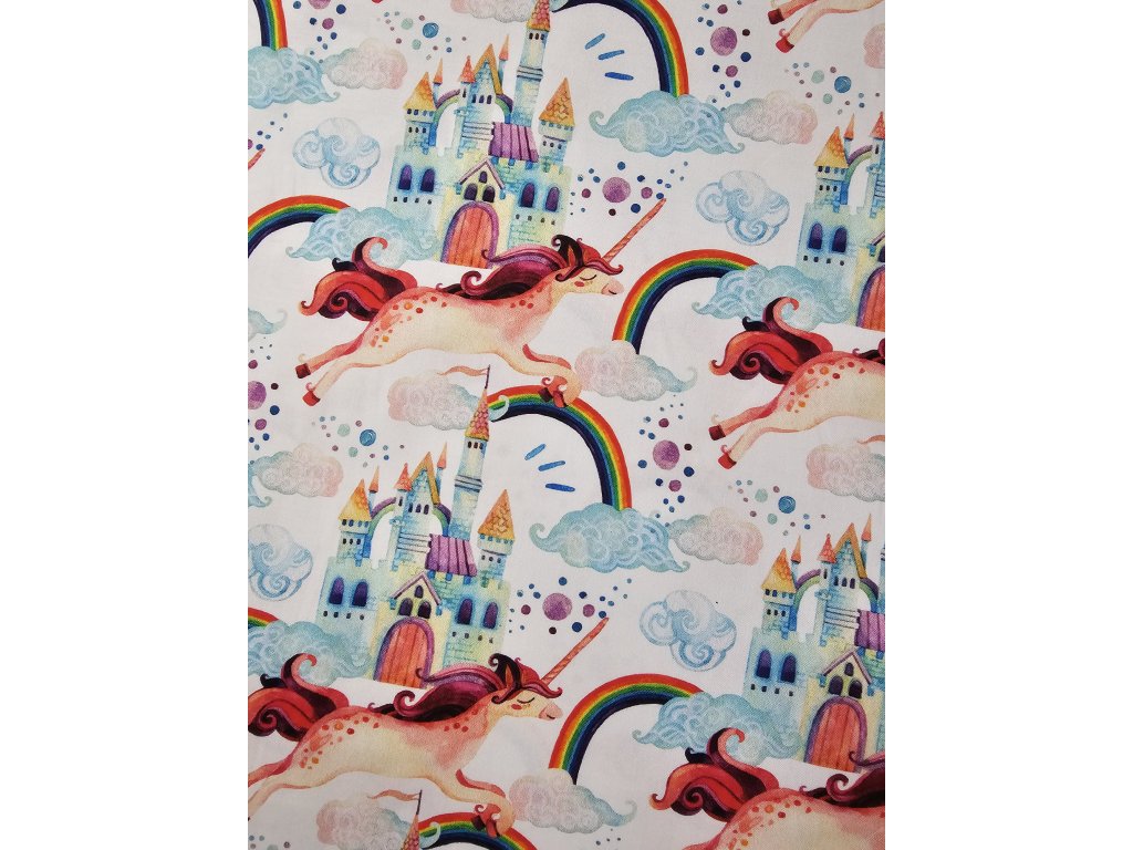 Pohádkový vzor s jednorožci, duhovými oblouky, obláčky a hrady na světlém podkladu. Motiv působí jemně, hravě a snově, ideální pro dětské oblečení, doplňky a projekty s pohádkovou atmosférou. Ideální na roztomilé hnízdečko pro miminko - holčičku