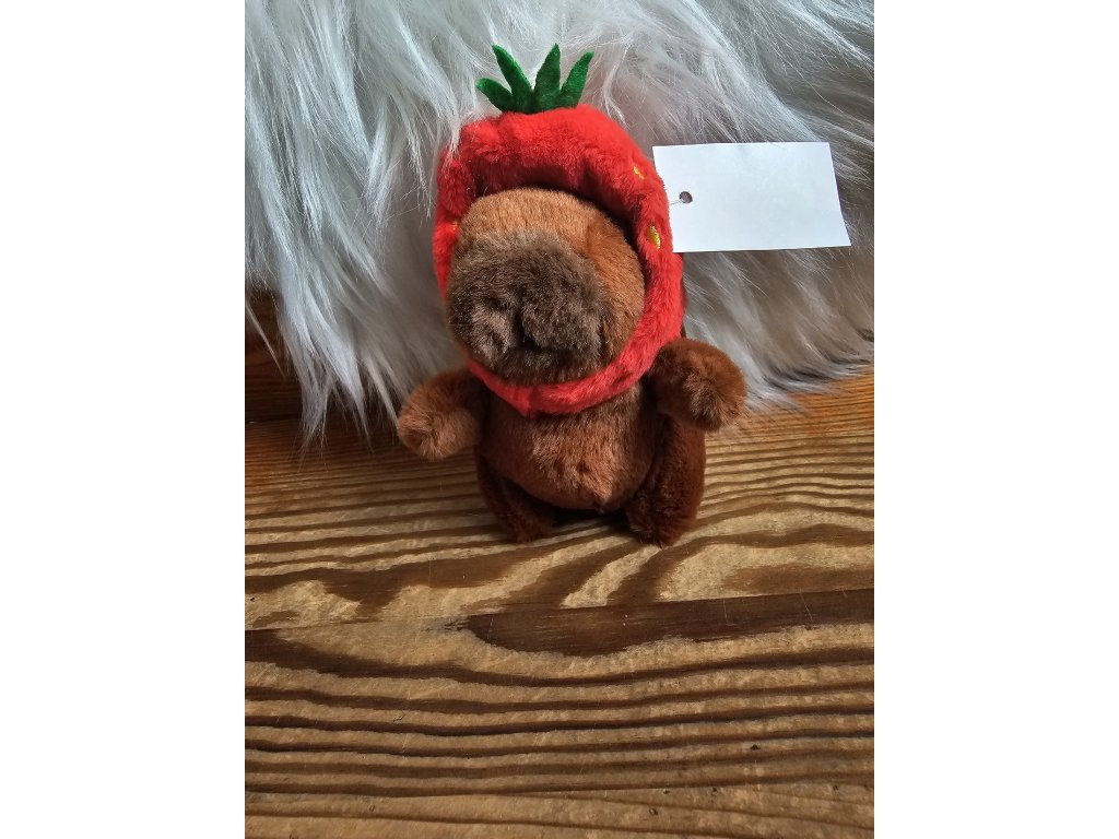 Roztomilá plyšová kapybara s červenou čepičkou ve tvaru jahůdky. Heboučký mini plyšák, který se stane veselým společníkem doma i na cestách.