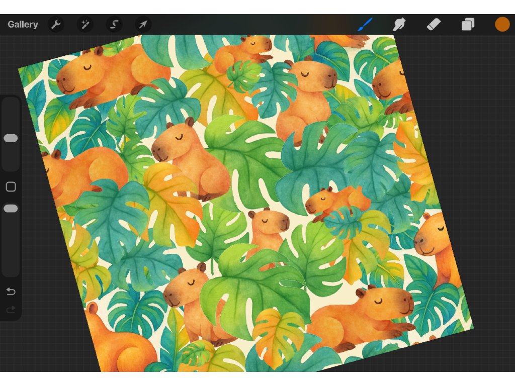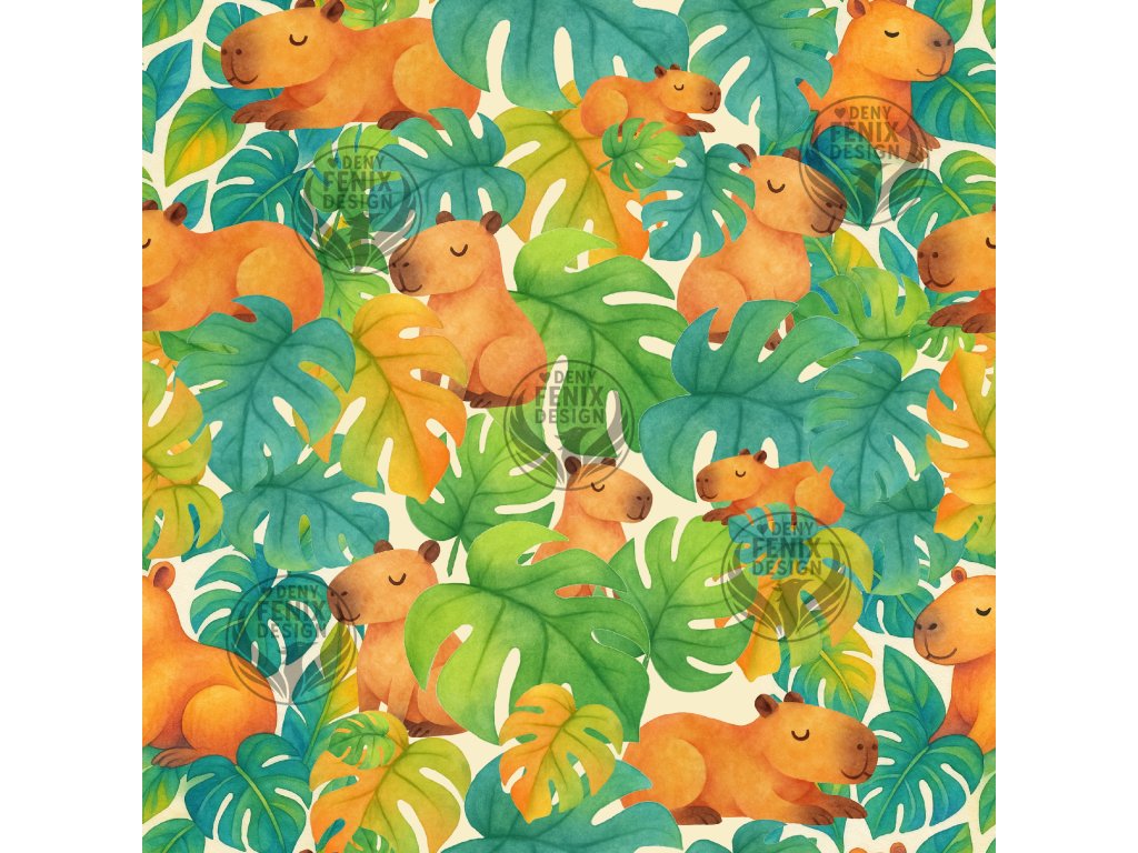 Vzor Kapybary v monsterách je dokonalým spojením tropické svěžesti a roztomilé zvířecí pohody. Jemně akvarelové kapybary se spokojeně ukrývají v hustém pralese monster, odpočívají, spí a působí maximálně uklidňujícím dojmem. Barevná paleta zelených, tyrkysových a žluto-oranžových listů dodává vzoru radostný letní nádech.