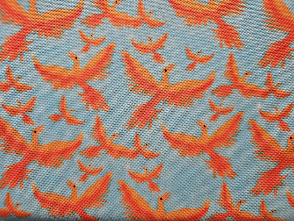 Kočárkovina se vzorem ohnivého Fénixe na bledě modré s pozadím oblohy.