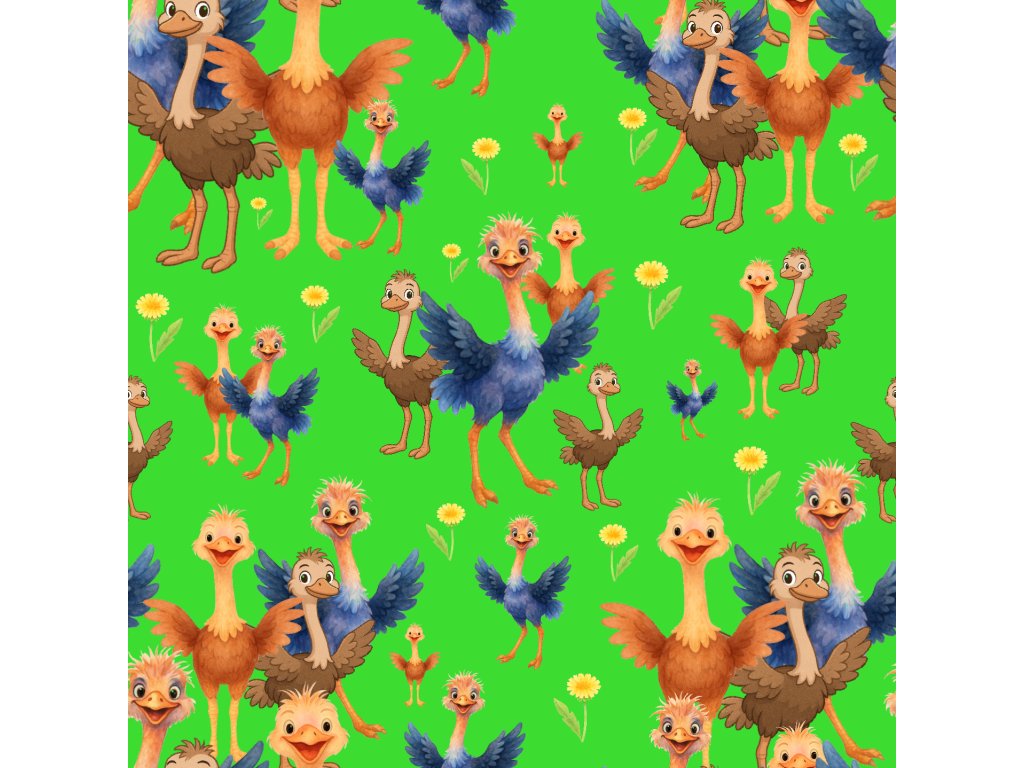 Veselý autorský vzor s hravými pštrosy v pohybu. Výrazné barvy a opakující se motiv působí živě a zábavně, ideální pro dětské projekty i výrazné doplňky. Digitální tisk