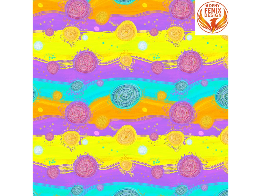 Každá spirála je ručně kreslená a doplněná barevnými tahy i drobnými puntíky, díky čemuž vzor působí jako malovaný akvarel – živý, spontánní a veselý.