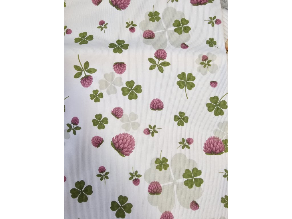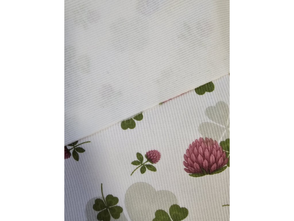 Bílý žebrovaný úplet jetelem a ctyřlístky. Roztomilý dětský vzor krásně doplní vzor s morčaty z naší nabídky.