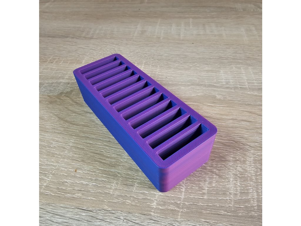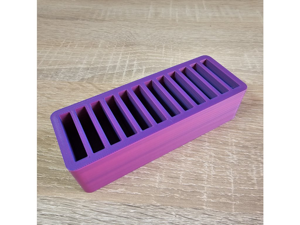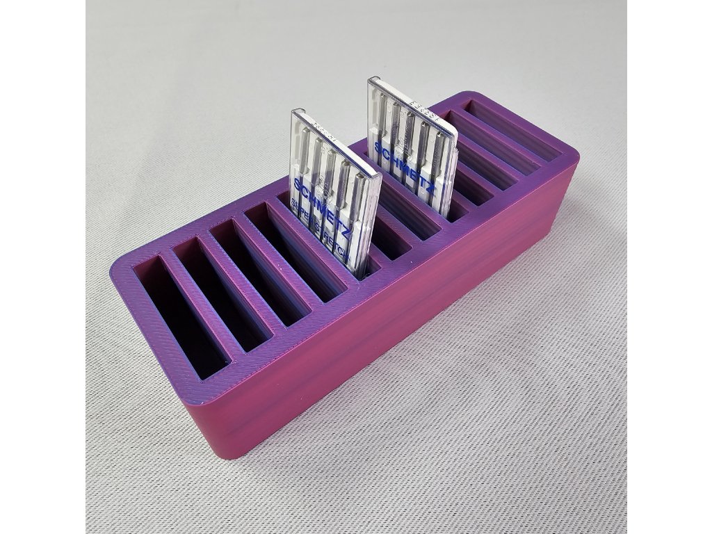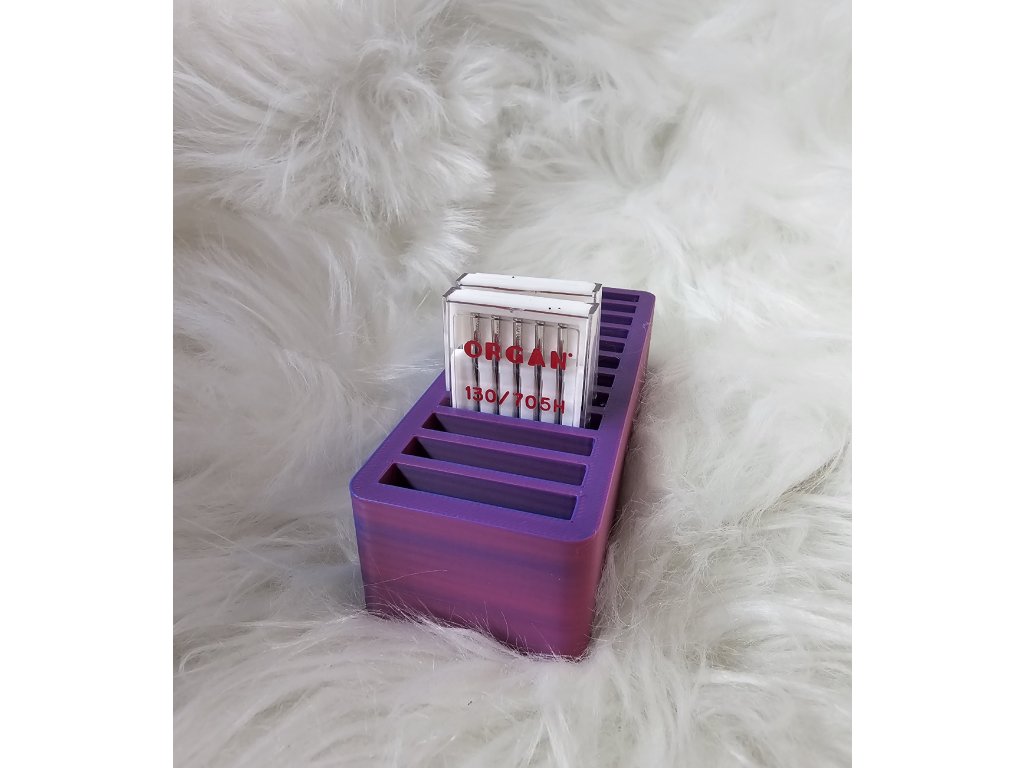 Stojánek je vyzkoušený na jehly značky Schmetz a Organ v menším balení (5 ks) Barva je fialovo růžová : záleží na úhlu pohledu. Zajímavý efekt, který obzvláštní vaší poličku nebo šicí koutek..