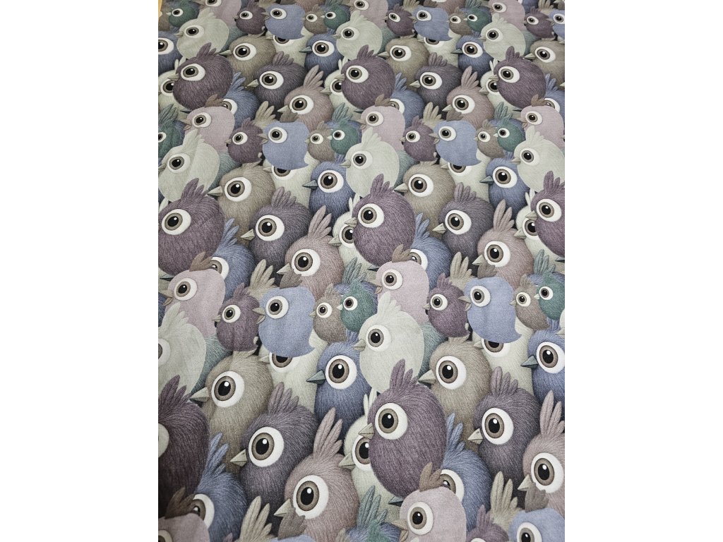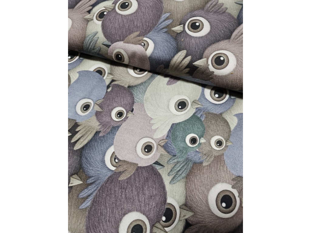 Originální bavlněný úplet s autorským vzorem jemně tónovaných ptáčků s velkýma očima. Stylový a hravý motiv v klidných barvách, který potěší malé i velké. Materiál je pružný, příjemný na tělo a neprůhledný.