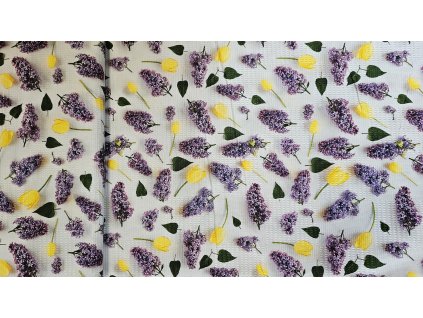 Bavlněná vaflovina – Šeříky a tulipány 💜🌼 Vůně jara v každém stehu! Bavlněná vaflovina s jemnou plastickou strukturou a romantickým vzorem šeříků a žlutých tulipánů...