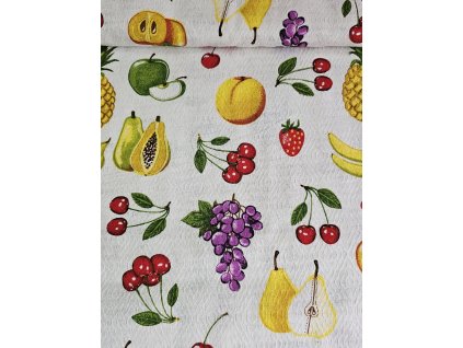 Bavlněná vaflovina – Šťavnaté ovoce 🍓🍍🍒 Rozzáři svou kuchyň barvami léta! Tahle vaflovina s veselým ovocným motivem přináší šťavnatý mix třešní, hrušek, hroznů, banánů...