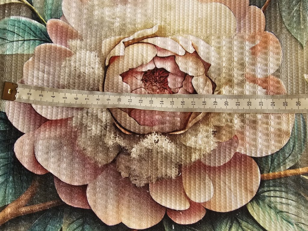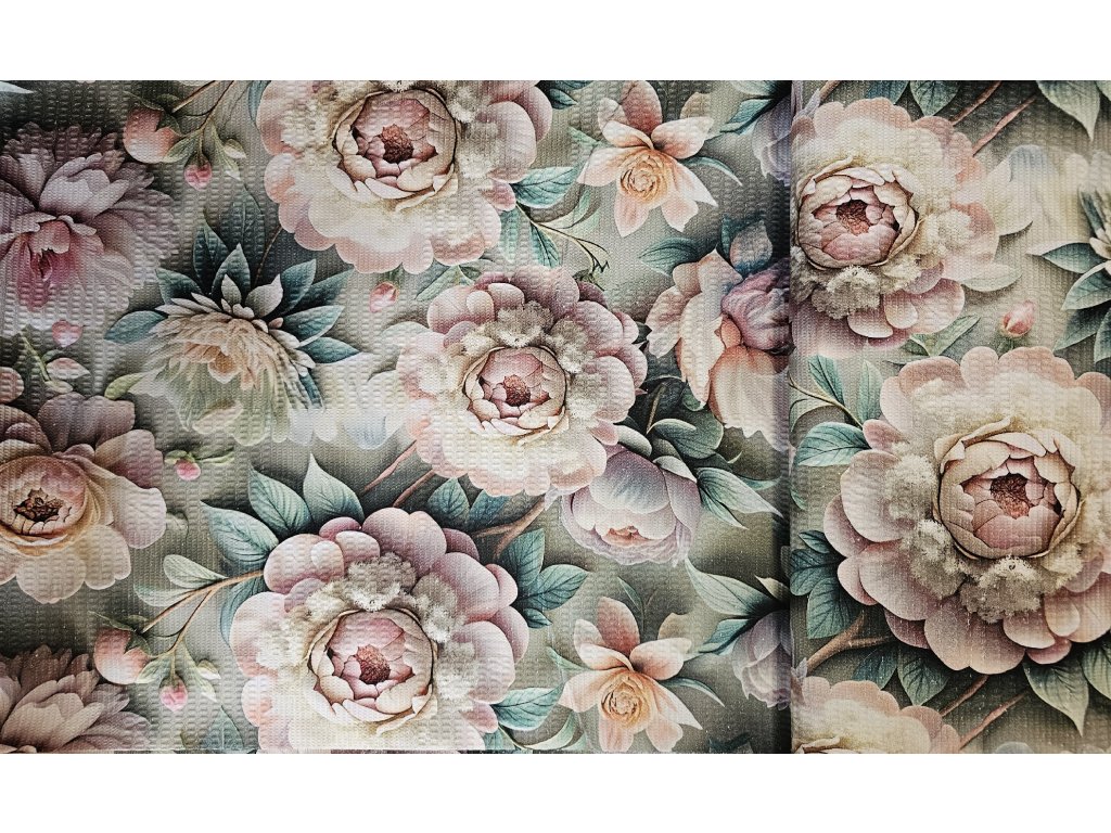 Květinový sen v pastelových barvách. Tahle luxusní bavlněná vaflovina s plastickou strukturou a jemným vzorem růžových a béžových květů pivoňky vnese do každého projektu nádech romantiky a elegance. Látka je měkká, prodyšná a výborně saje – ideální pro výrobky, které mají být krásné i praktické.